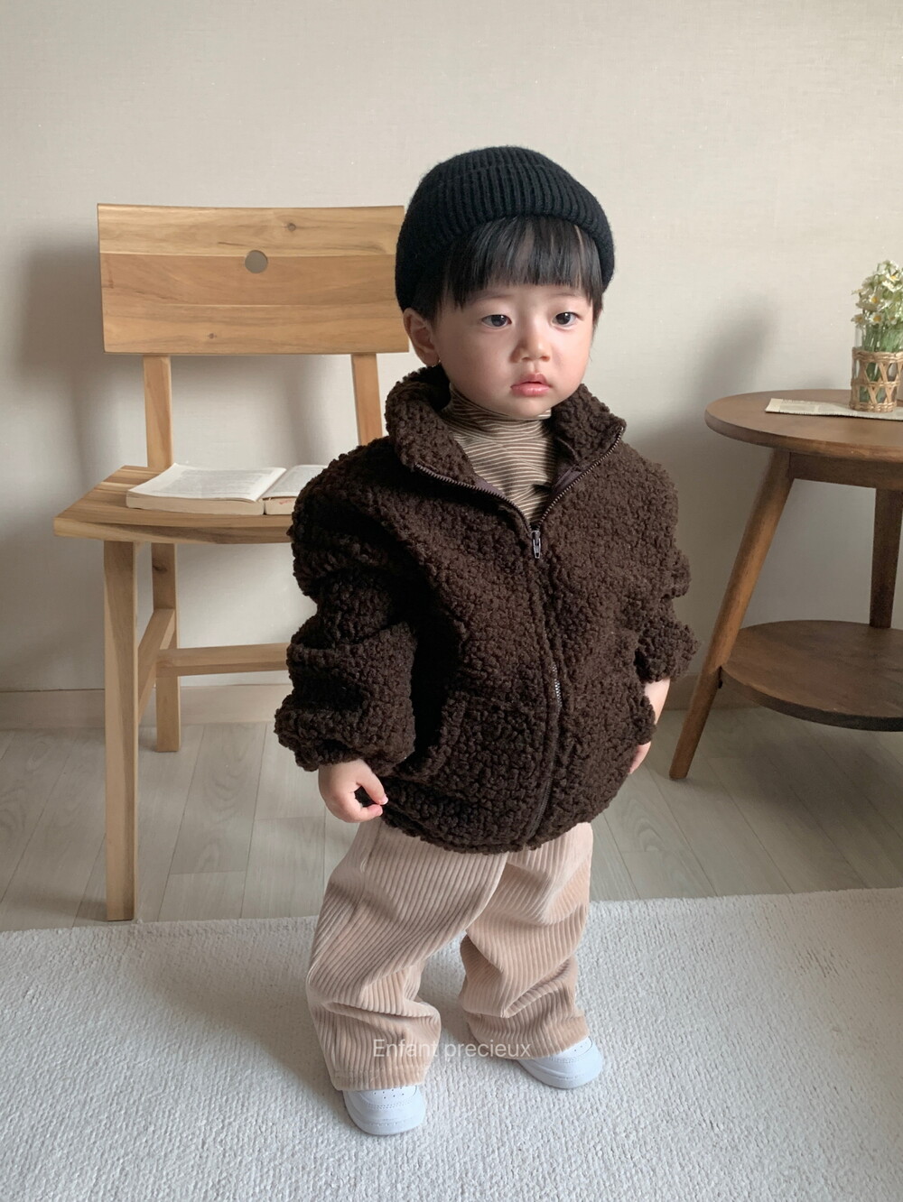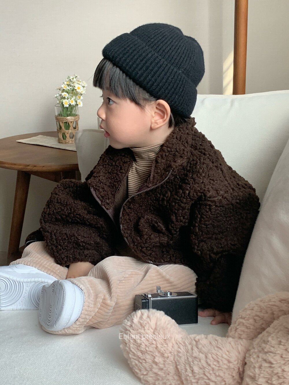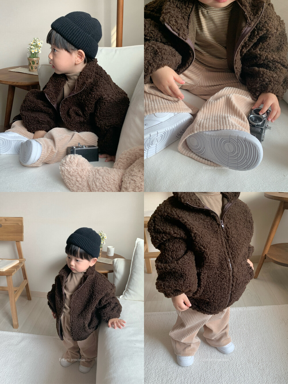 뽀글 소재에 딥한 브라운 컬러가 들어가니 한층 고급스러운 느낌이예요.