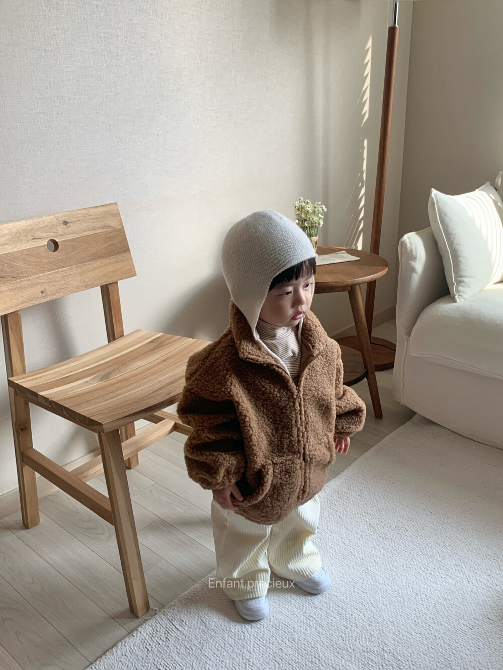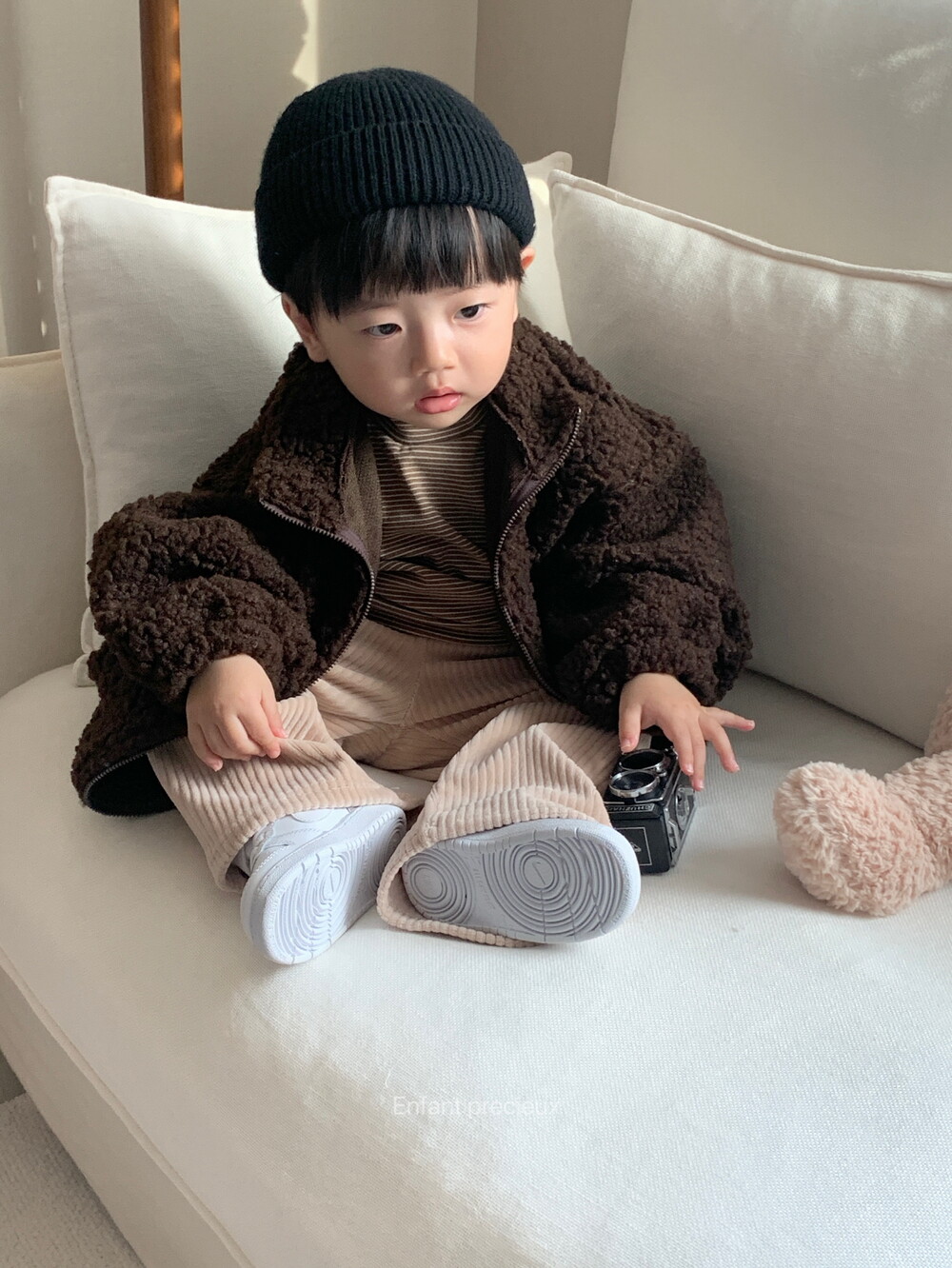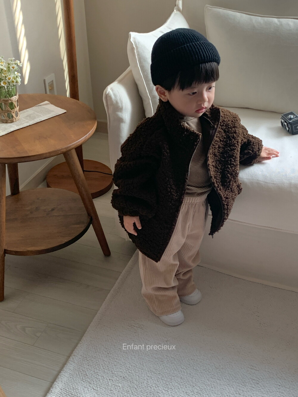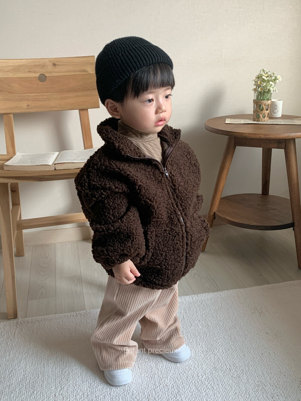 뽀글 소재에 딥한 브라운 컬러가 들어가니 한층 고급스러운 느낌이예요.